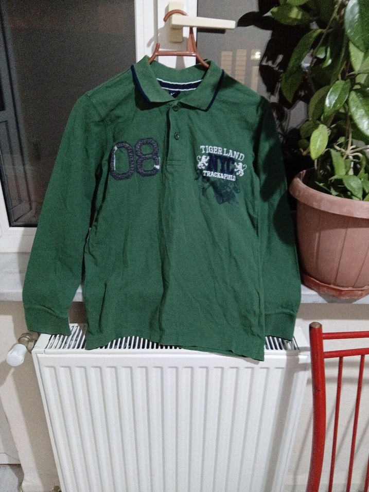 Koyu yeşil renkli, düğmeli polo yaka ve uzun kollu erkek çocuk sweatshirtü. Önü baskılı, bol kesimdir ve yumuşak, sıcak tutan kumaştan üretilmiştir.