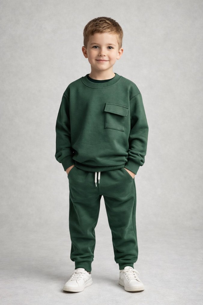 Erkek çocuk için rahat kesim, crew neck sweatshirt ve eşofman altından oluşan haki renkli takım. Yumuşak ve sıcak kumaştan, gündelik şıklık sağlar.