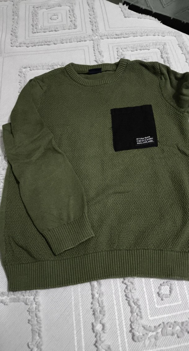 Bu koyu haki erkek çocuk kazağı, yuvarlak yaka ve uzun kollu, yumuşak triko kumaştan ve bol kesimlidir. Siyah göğüs cebine sahiptir.
