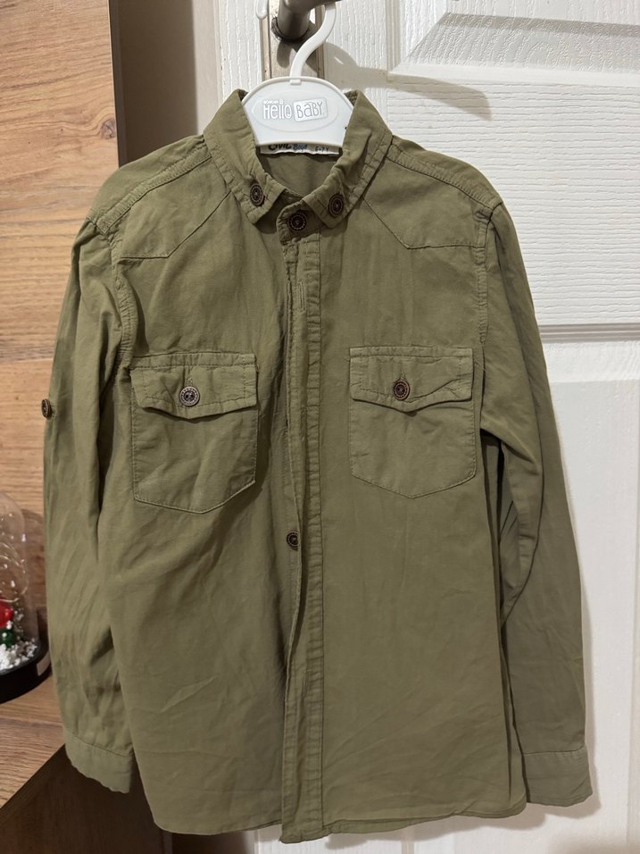 Keten kumaştan, uzun kollu erkek çocuk gömleği. Haki renkte, düğmeli ve yakası kesik detaylıdır. Rahat ve salaş kesim, iki cep bulunur.