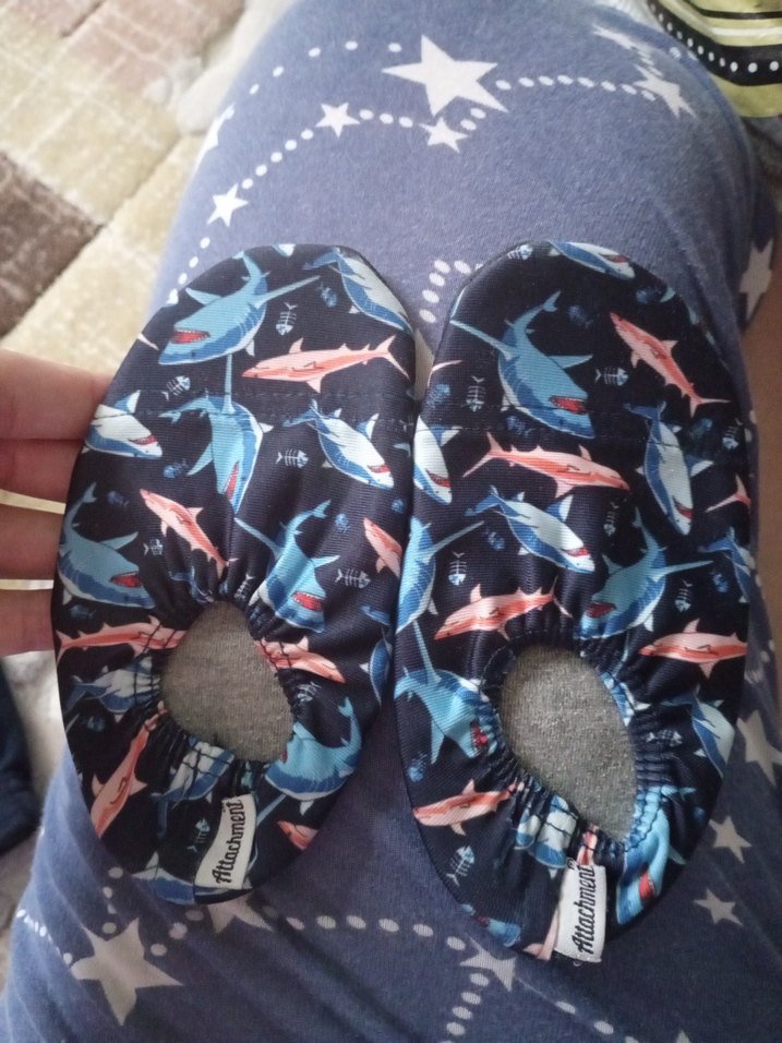 Renkli köpekbalığı desenli, gevşek kesim havuz deniz ayakkabisi. Rahat kullanım için midi boyda tasarlanmıştır. Hiç kullanilmadi.tertemizdir. Etiketi yok hediye getirildi. 1 veya 2 yaş aralığı numarasi