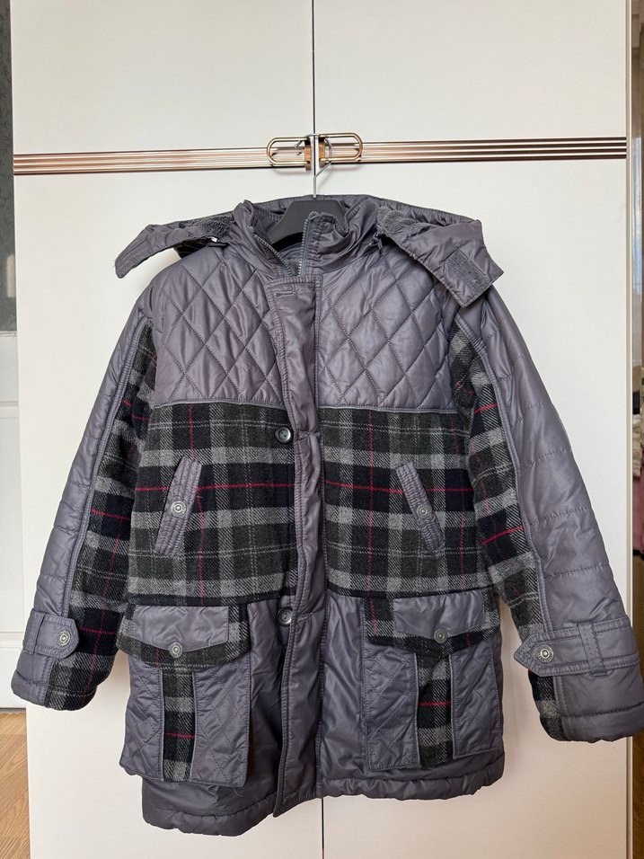 gri kapitone ve ekose desen detaylı içi kürklü ,hem düğmeli hem fermuarlı erkek çocuk mont.Az kullanıldı.içi kürklü olduğu için gayet sıcak tutar.10-14 yaş uyumlu. Marka temsili