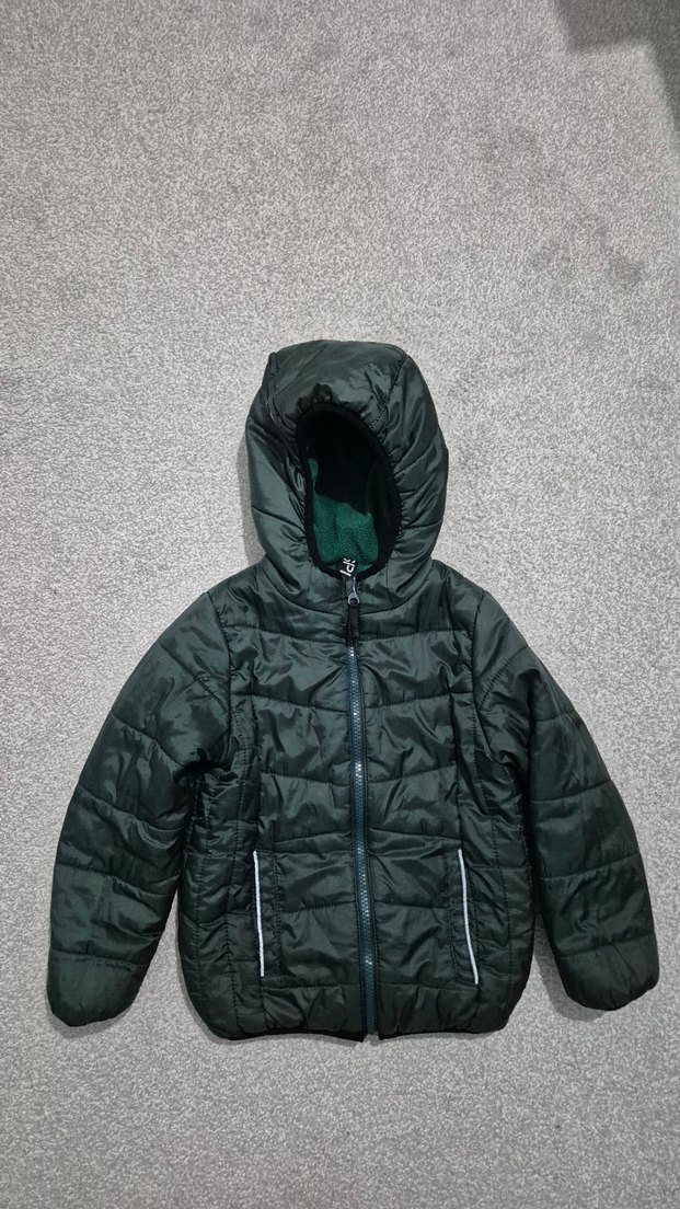 Erkek çocuklar için fermuarlı, kapüşonlu, yeşil renkte yumuşak ve sıcak kumaştan yapılmış, sokak tarzına uygun dar kesim mont.