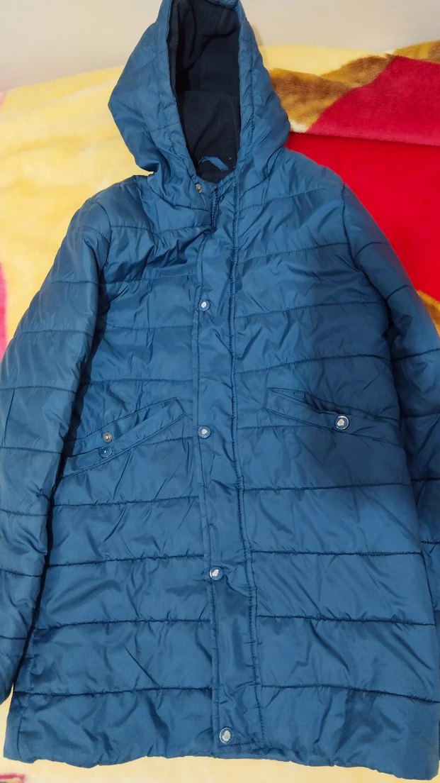 12-13 yaş. Mavi renkli, fermuarlı düğmeli ve kapüşonlu çocuk kışlık mont. Midi boy. İçi Polarlı sıcacık tutan rahat sorunsuz bir mont.