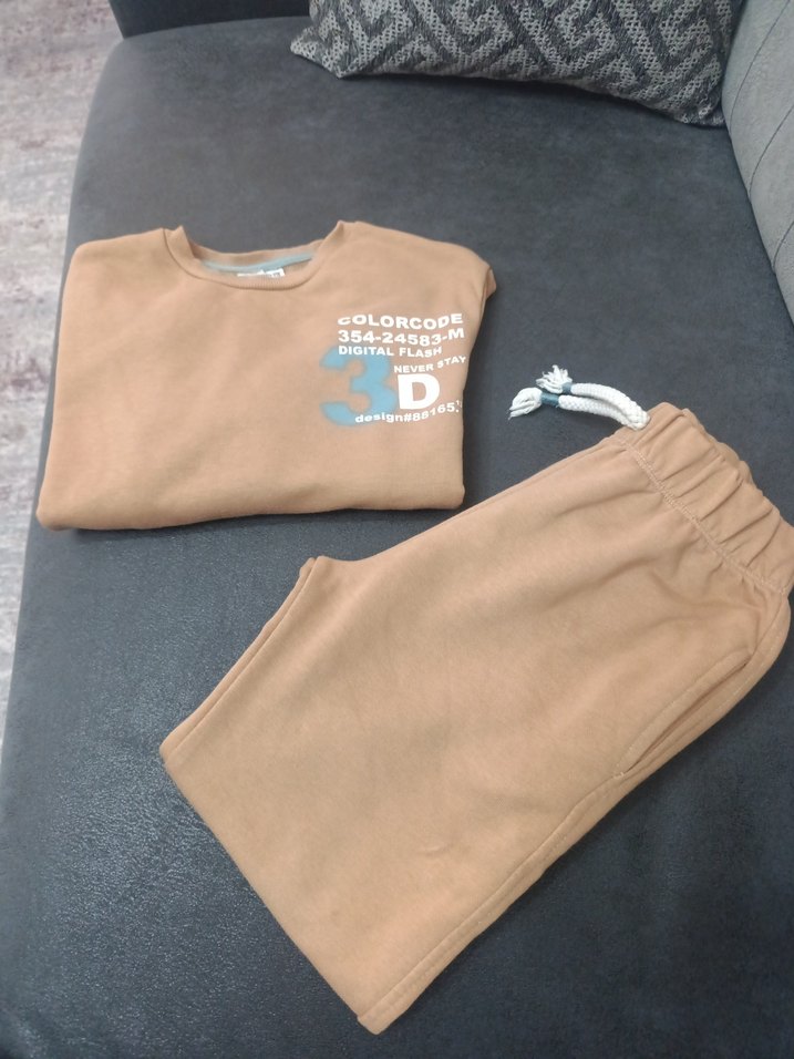 erkek için camel renkli, bol kesim, uzun kollu, yuvarlak yakalı ve baskılı üst ile rahat eşofman takımı. Yumuşak ve sıcak kumaştan üretilmiştir.