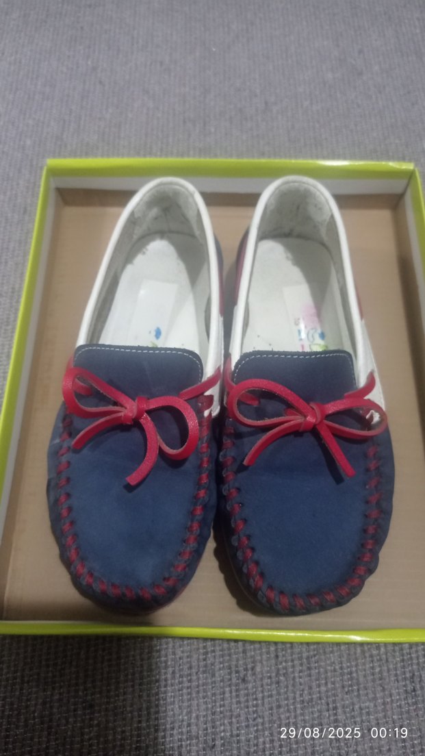 erkek çocuk için mavi süet malzemeden yapılmış, kırmızı fiyonk ve dikiş detaylı klasik tarzda loafer ayakkabılar.