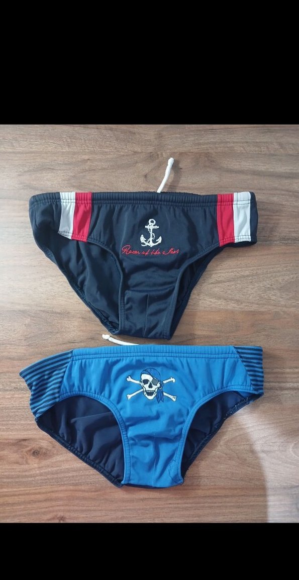 Lacivert ve mavi renklerde, denizci ve korsan desenli erkek çocuk mayo. Ayarlanabilir bağcıklı elastik bel bantlı.