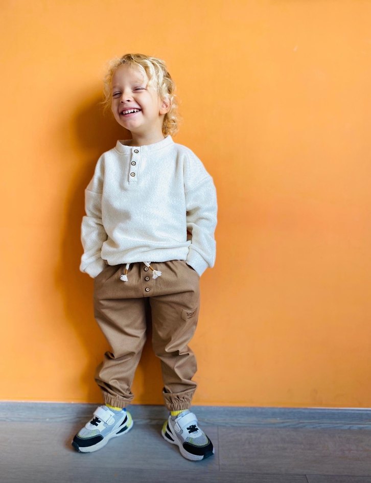Erkek çocuklar için açık kahverengi pamuklu, bağcıklı ve bağcıklı rahat kesim eşofman, bağcıklı ve kolay şıklık sunar.