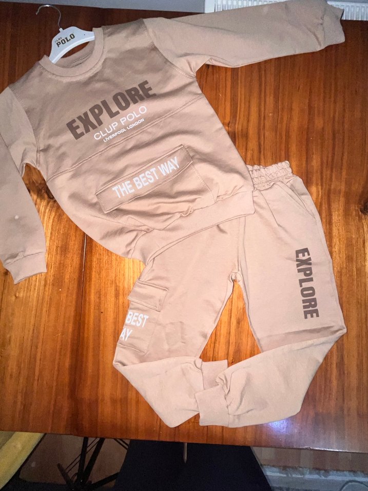 Kahverengi baskılı erkek çocuk eşofman takımı, bol kesim ve yuvarlak yaka ile rahat bir görünüm sunar. Yumuşak ve sıcak kumaştan yapılmıştır, "EXPLORE" yazısı dikkat çeker. ️ 7/8/9/10 yaş mevcuttur