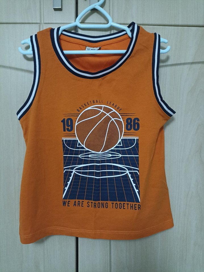 Kahverengi, baskılı basketbol temalı, kolsuz, fitted kesim erkek çocuk tişörtü. Yuvarlak yaka ve sokak stilinde, sentetik kumaştan üretilmiştir.