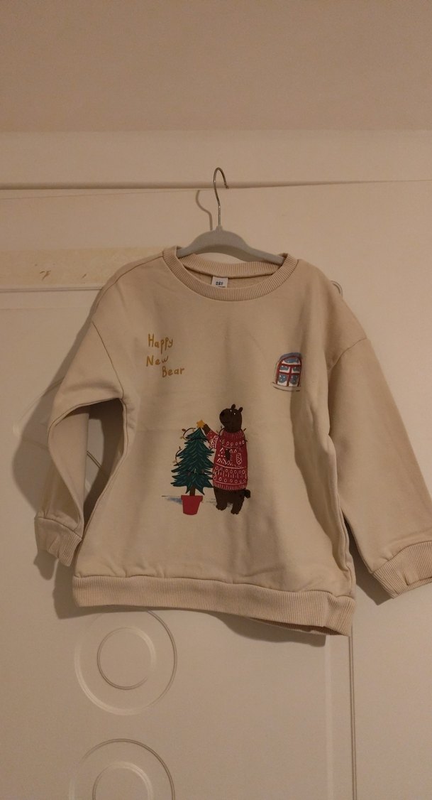 Pastel kahverengi, bol kesim erkek çocuk sweatshirtü, yuvarlak yaka ve uzun kollu. Örgü dokusu ve ayının ağaç süslediği baskı deseni bulunur. Rahat ve günlük tarzda.