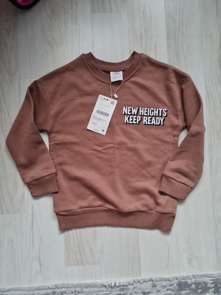 Kahverengi erkek çocuk sweatshirt, bisiklet yaka ve uzun kolludur. Bol kesimdir, 'NEW HEIGHTS KEEP READY' baskılıdır ve yumuşak, sıcak kumaştan üretilmiştir.