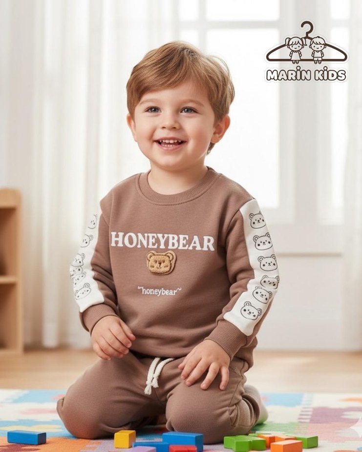 Yumuşak kumaştan kahverengi, uzun kollu, baskılı ve rahat kesim erkek çocuk sweatshirtü. Önünde ve kollarda gri ayı desenleri ve "HONEYBEAR" yazısı bulunur. 3 boyutlu ayı deseniyle üç iplik ikili takımımız 1-2-3-4 yaş seçenekleriyle stoklarımızda mevcuttur.