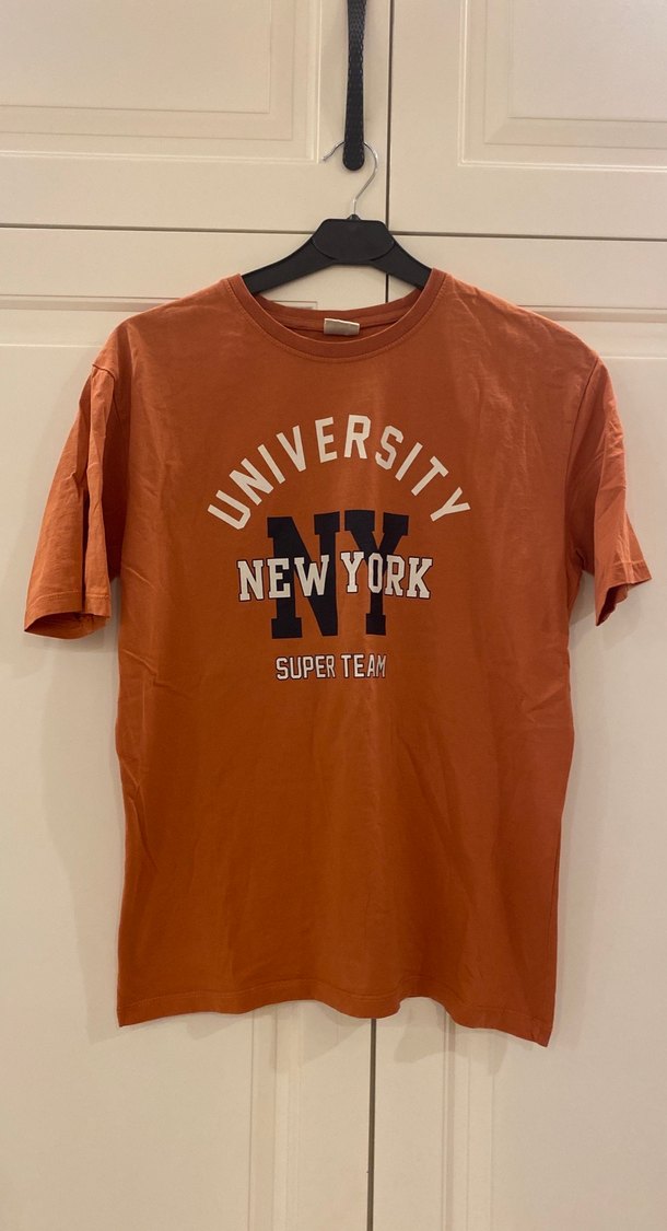 Kahverengi erkek çocuk tişörtü, bol kesim ve kısa kolludur. Önünde 'University New York Super Team' baskısı vardır. Yumuşak sentetik kumaştan, yuvarlak yakalı ve sokak stiliyle dikkat çeker. ️