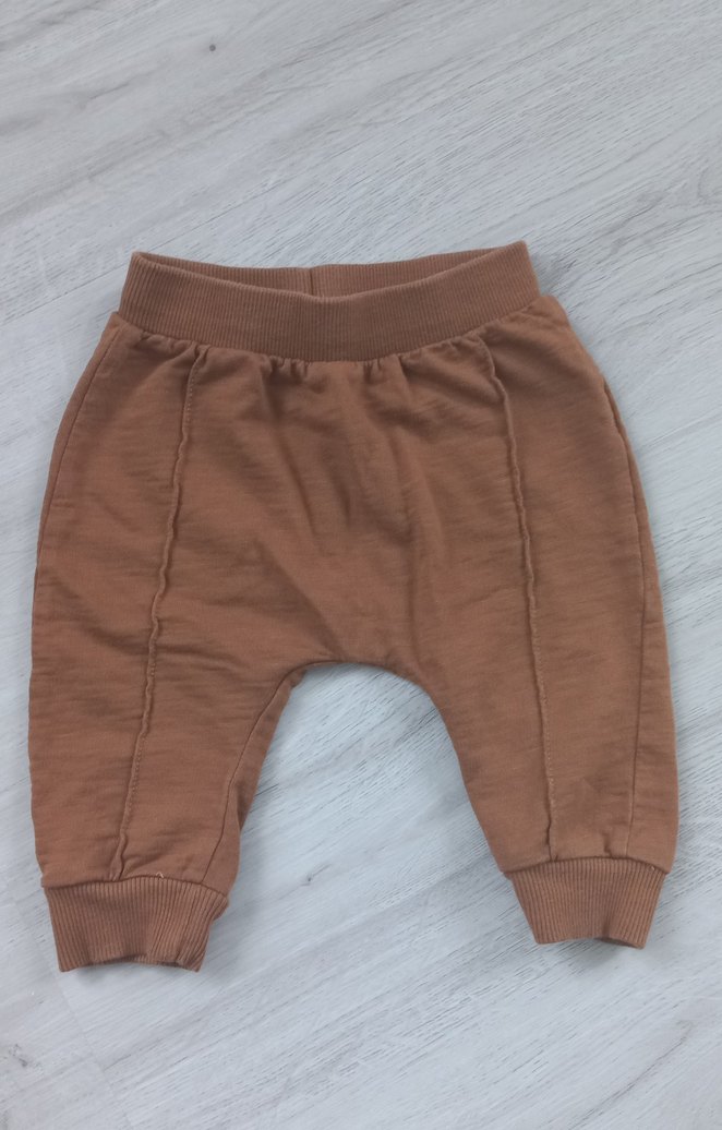 Erkek çocuklar için bol kesim, pastel kahverengi kumaştan yapılmış sade ve rahat pantolon. Sokak stili için uygun, zahmetsiz şıklık sunar. Üstü de vardır. kol boyu biraz kısadır