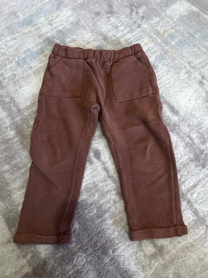 Koyu kahverengi, bol kesim erkek çocuk pantolonu, yumuşak ve sıcak kumaşlı, kürk detaylı. Lastikli bel ve ön ceplerle rahatlık sağlar.