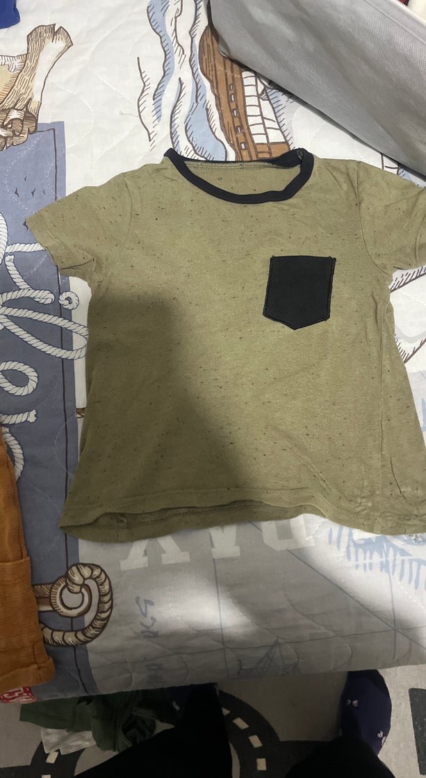 Kahverengi ve gri detaylı, pamuklu, bol kesim erkek çocuk kısa kollu tişört, yuvarlak yakalı ve kontrast cep detaylı.