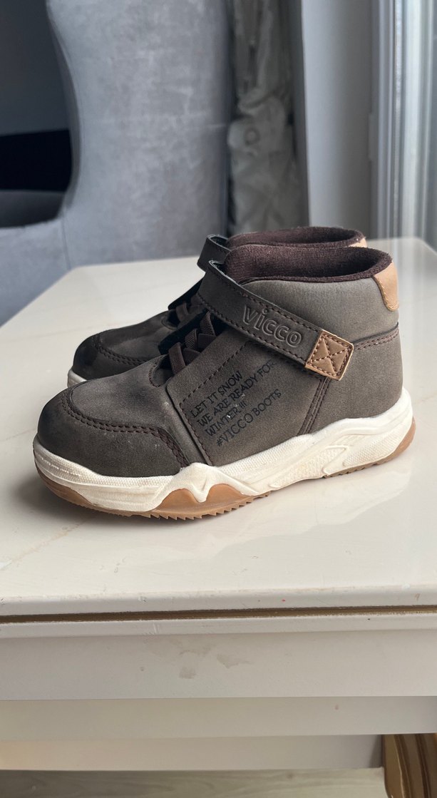 Kahverengi kauçuk malzemeden erkek çocuk botu, cırtlı kapanışlı, baskılı detaylara sahip, sokak modası tarzında. Rahat ve trend görünümlü. Az kullanılmış hasar yok 25 numara