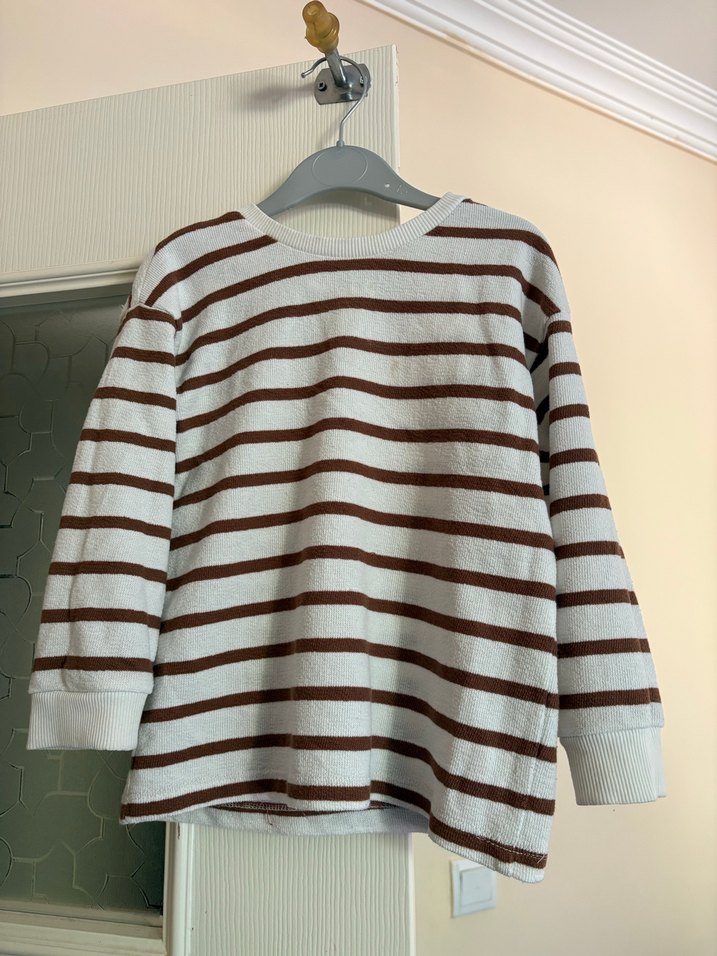 Uzun kollu, bisiklet yaka ve bol kesim erkek çocuk kazak. Yumuşak pamuktan örülmüş, kahverengi çizgili ve gri renklidir.
