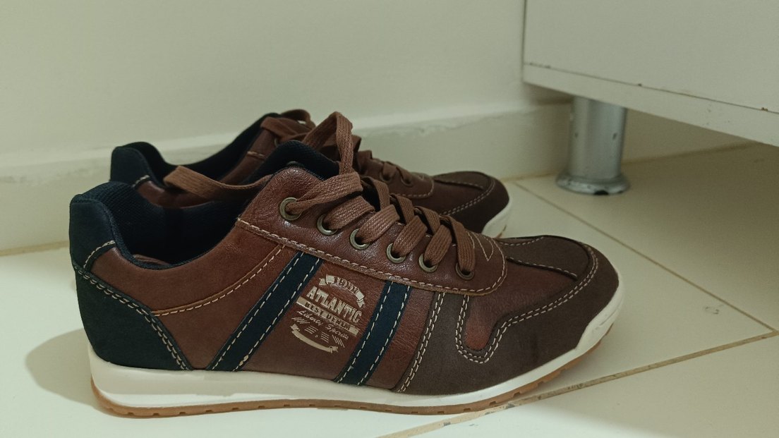 Koyu kahverengi deri erkek çocuk bağcıklı spor ayakkabı, baskılı yan detaylı. Trend sokak giyimi için rahat ve şık bir seçim. 40 numara ayakkabı
