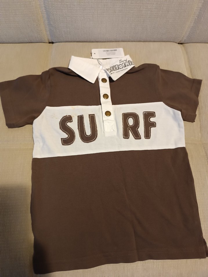 Kahverengi, pamuklu erkek çocuk polo tişörtü, kısa kollu ve düğmeli. Üzerinde "SURF" baskısı bulunan rahat kesim bir modeldir. 18-24 ay. hiç kullanılmadi dolapta katlı bir şekilde dururken çıtçıtlarindan penyesine hafif küf lekesi olmuş
