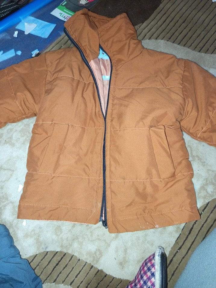 Fermuarlı, kahverengi parlak renkte, yumuşak keçe kumaştan yapılmış erkek çocuk montu. Sokak stiline uygun, yakası kesik yakalı ve vücuda oturan model.
