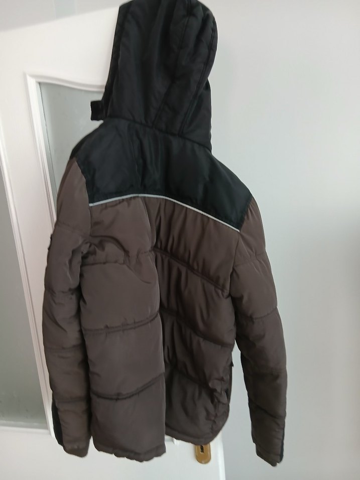 Fermuarlı ve yüksek yakalı, kahverengi ve gri tonlarında, yumuşak ve sıcak kumaştan yapılmış erkek çocuk montu. Trendy casual sokak stili için uygun.