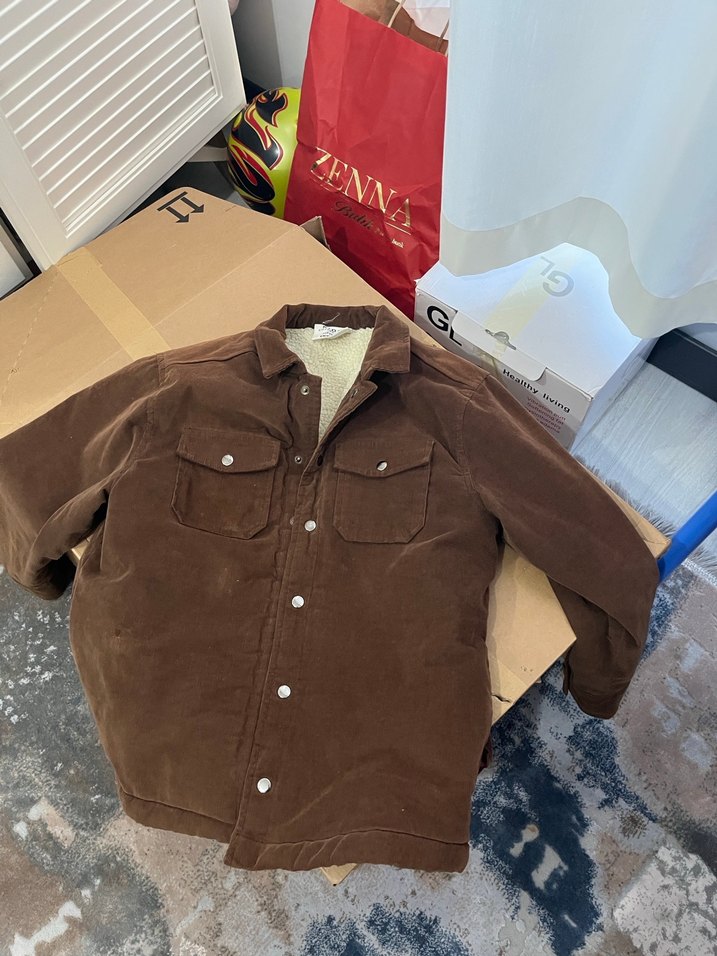 Erkek çocuk mont kahverengi kadife düğmeli ceket, uzun kollu ve notched yakalıdır. Salaş kesim ve midi boyda, günlük rahat kullanım için uygundur. "Defacto ambalajda görünür. Çok az kullanıldı sıfır gibi hızlı büyüdüğü için az giydi 8 /9 yaş