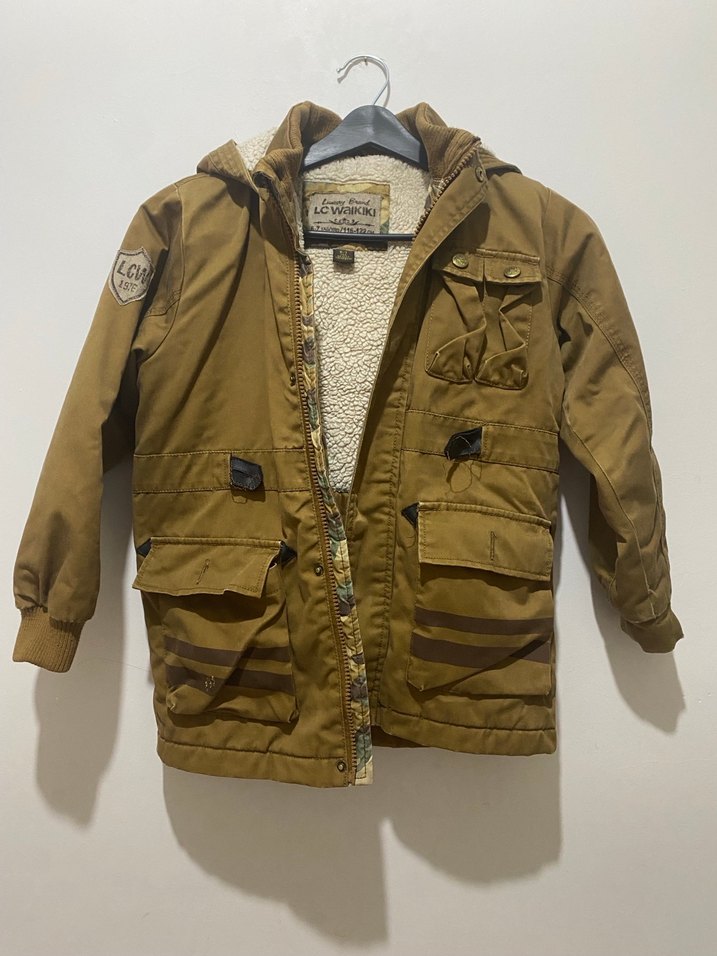 Kahverengi erkek çocuk mont düğmeli ön ve kesik yaka detayına sahiptir. Kamuflaj desenli, regular fit ve yumuşak, sıcak kürk astarlı rahat bir monttur.