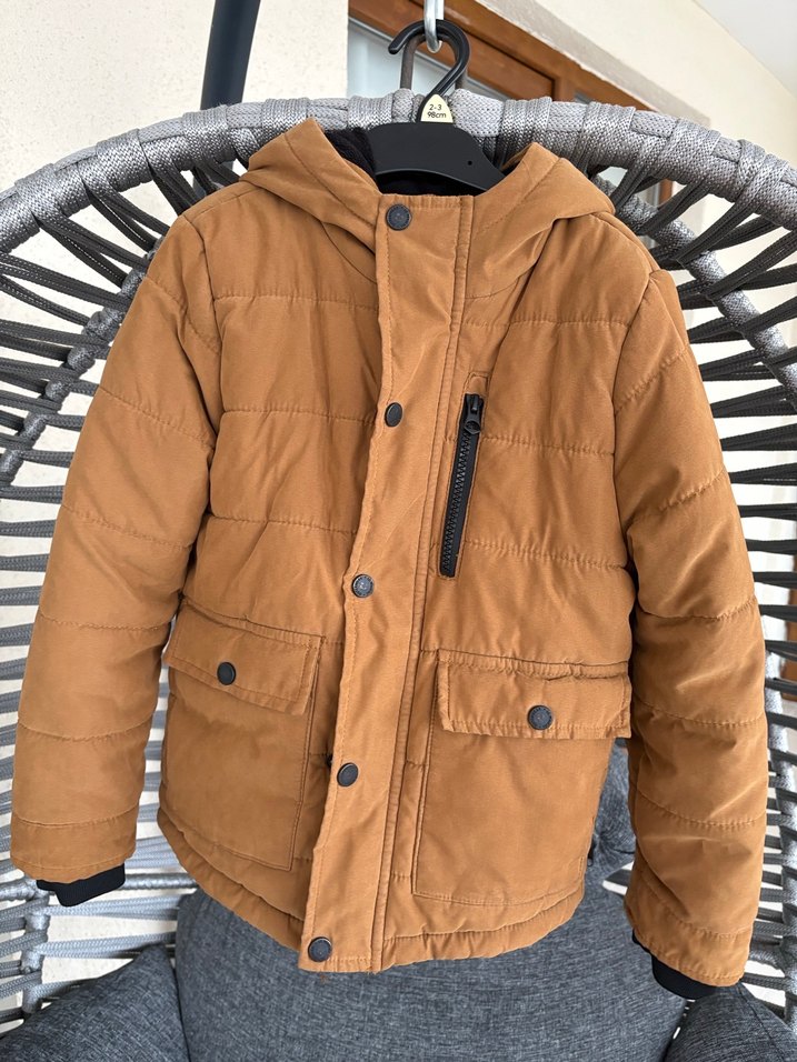 Kahverengi, kapüşonlu erkek çocuk mont, düğmeli ve fermuarlı ceplerle, yumuşak ve sıcak kumaştan, sokak stili için uygun. Herhangi bir sorun yoktur zaten çok çok az kullanıldı.