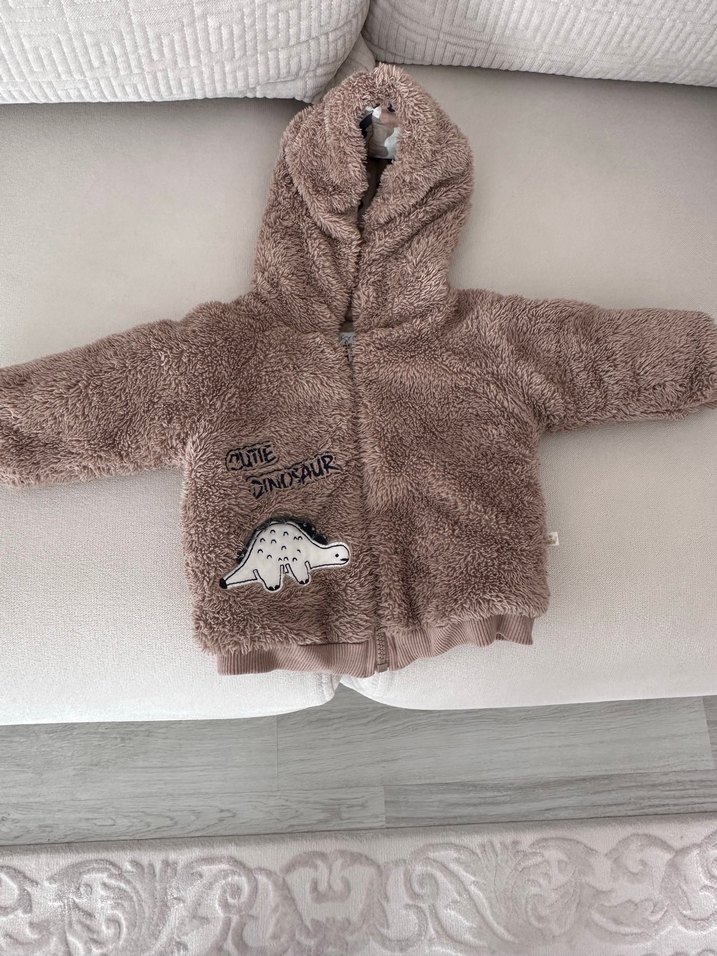 Kahverengi, kapüşonlu, peluş dokulu ve nakışlı dinozor desenli erkek çocuk ceket, rahat kesim ve sokak tarzı için uygundur.