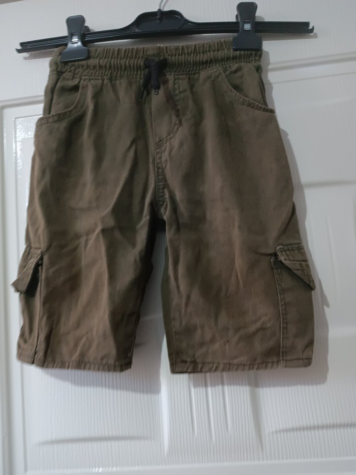 Kemerli bel ve yan cepleri olan, yumuşak sentetik kumaştan yapılmış erkek çocuk kahverengi rahat şort. Sokak giyimi tarzına uygun.