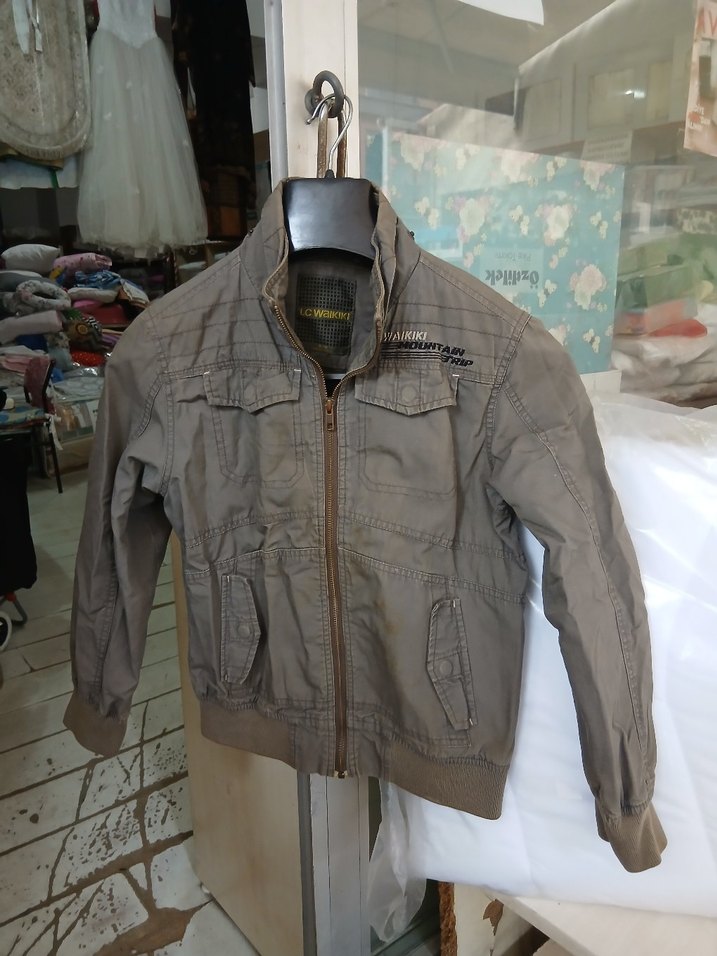 Trendy casual tarzı için keten kumaştan, kahverengi, düğmeli ve kesik yaka detaylı bol kesim erkek çocuk ceketi. en 45 boy 54