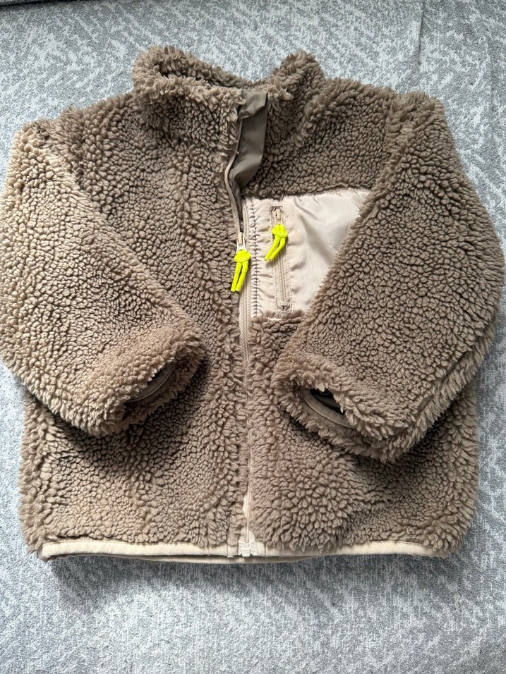 Kahverengi, kürklü detaylı, notched lapel yakalı, bol kesim erkek çocuk ceketi. Rahat ve sıcak tutar.