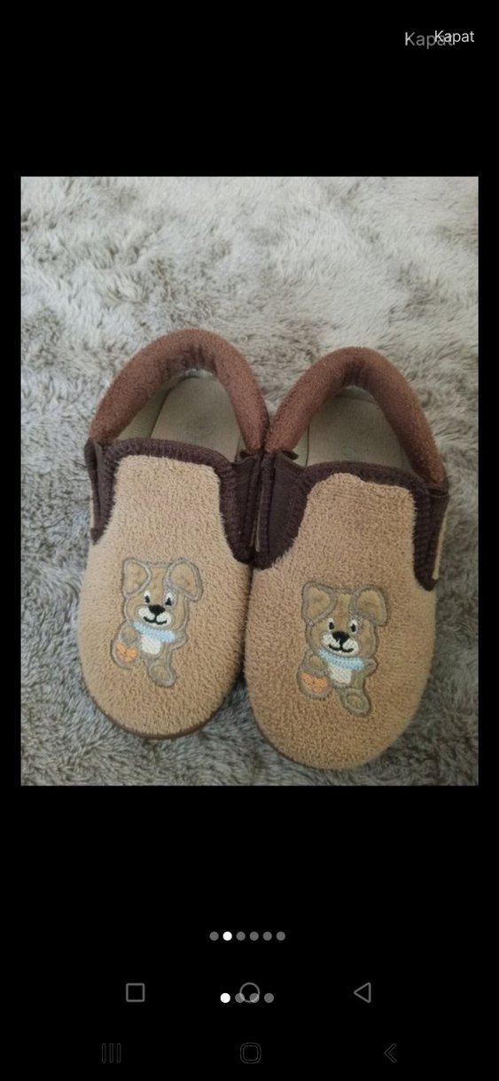 Yumuşak kumaş ve kürk detaylı kahverengi erkek çocuk terliği, nakışlı köpek desenli. Rahat ve günlük kullanıma uygun. sadece bir kenarında ufak söküğü var resimlerde belirtilmiştir