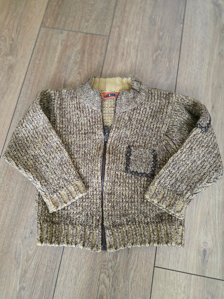 Uzun kollu, fermuarlı ve gevşek kesim erkek çocuk örgü hırka. Kahverengi ve krem tonlarda, küçük cepli ve sokak stili görünümlü.