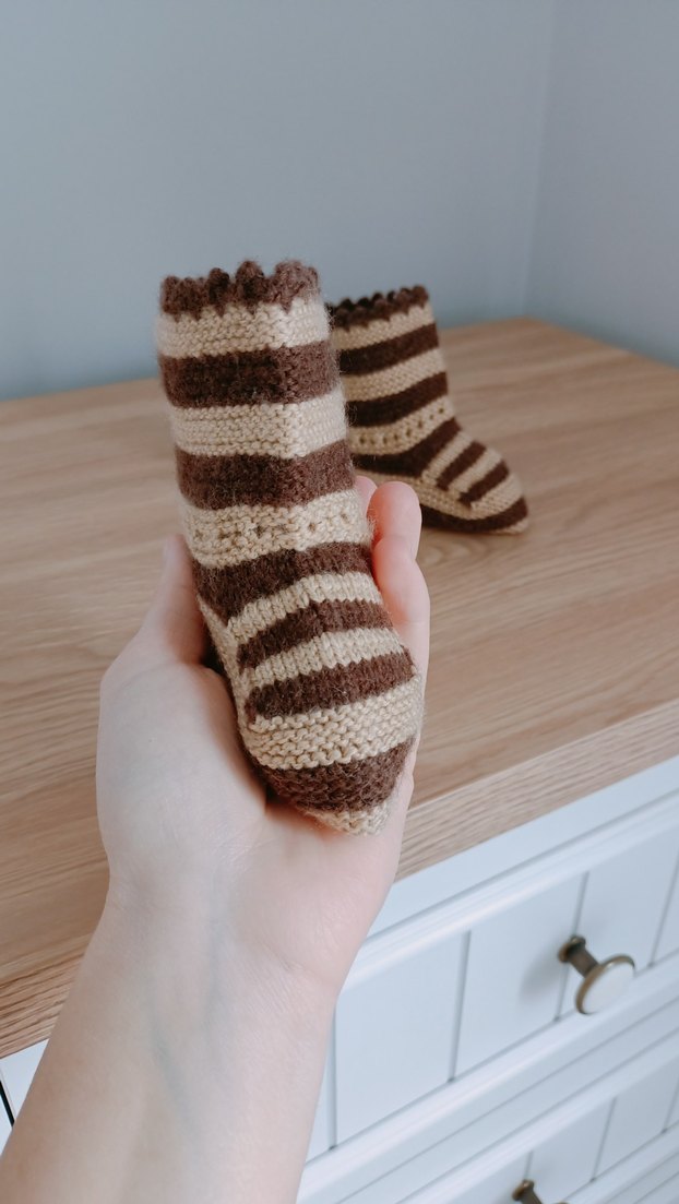 Kahverengi ve gri zebra desenli örgü kız çocuk botları. Bohem tarzda, yumuşak ve rahat, günlük kullanım için uygundur.