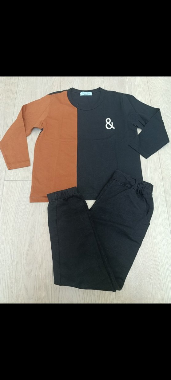 Erkek çocuklar için kahverengi ve siyah renk bloklu, yuvarlak yakalı üst ve eşofman altından oluşan streetwear takımı. Yumuşak ve sıcak kumaştan, rahat kesim, Üst sıfır, alt birkaç kez giyildi,sorunsuz,marka temsili