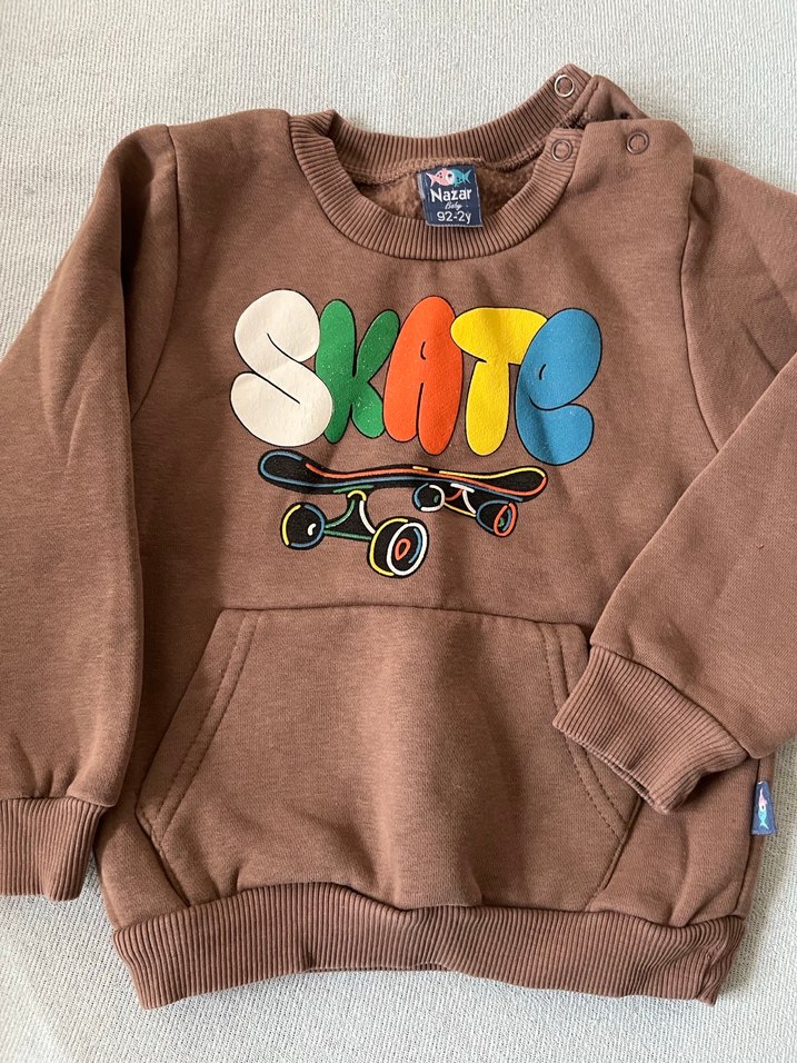 Kahverengi, uzun kollu ve bisiklet yaka sweatshirt. Rahat kesimli, yumuşak ve sıcak kumaştan. Önünde renkli skate baskısı ve örme manşetler bulunur.