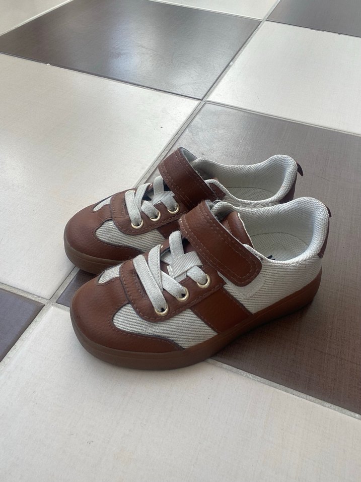 Gri detaylı kahverengi erkek çocuk spor ayakkabısı, kolay kullanım için cırt cırtlı ve kauçuk tabanlıdır. Sokak stili için uygundur.