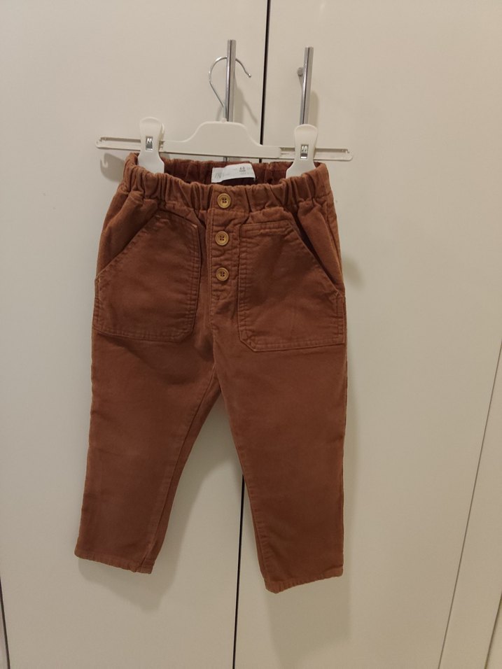 Erkek çocuklar için koyu kahverengi süet pantolon, bol kesim ve düğmeli ön kısmıyla rahatlığı ve sokak tarzını bir araya getirir. Düz dokulu ve kullanışlı ceplidir.
