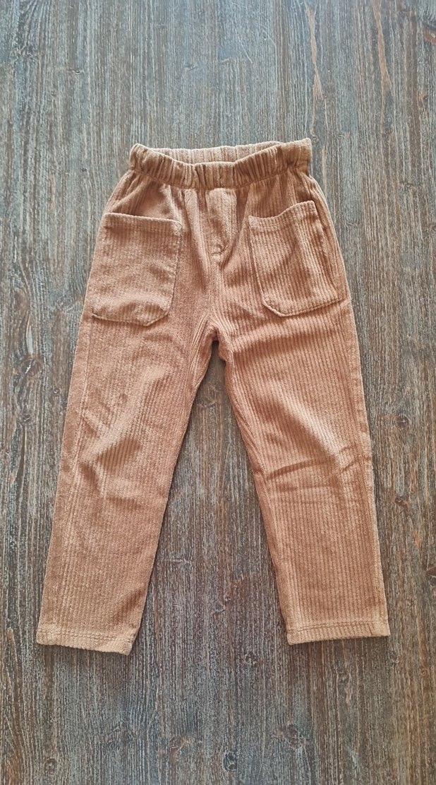 Erkek çocuklar için düğmeli detaylı, ön cepli kahverengi süet bol pantolon. Rahat ve günlük stile uygun.