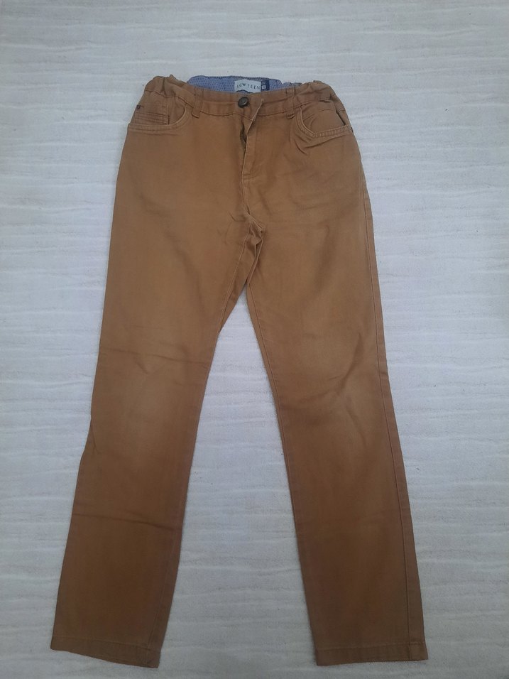 Kahverengi süet kumaştan, kemerli ver skinny fit erkek çocuk pantolonu. Düz renk, sokak stiline uygun rahat tasarım.