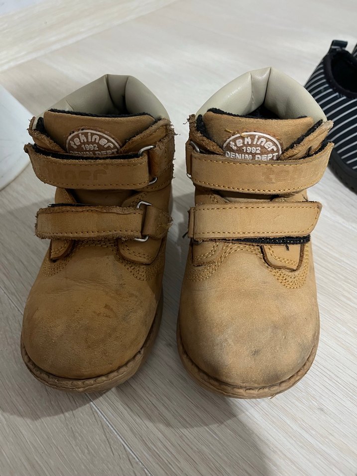 Kahverengi süet erkek çocuk botları, tokalı kayışlarla. Sokak stiline uygun, desen içermeyen, rahat ve şık tasarım.