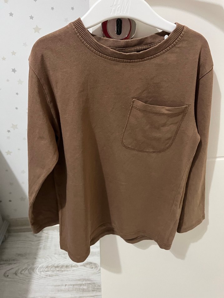 Kahverengi erkek çocuk sweatshirt, uzun kollu, yuvarlak yaka ve bol kesimdir. Yumuşak keten kumaştan yapılmış, sade ve şık bir sokak stili sunar, küçük göğüs cebine sahiptir.