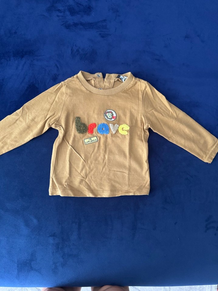 Erkek çocuklar için uzun kollu, bisiklet yaka kahverengi sweatshirt. Sırtında düğmeli, yumuşak ve sıcak kumaştan, baskılı desenli.