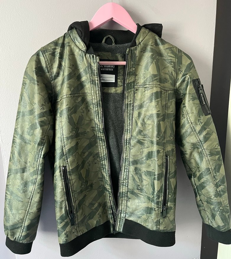 Erkek çocuklar için kamuflaj desenli, deri malzemeden yapılmış, fermuarlı cepleri ve kesimli yakası olan rahat sokak stili ceket. İç kısmında küçük yuvarlak şeklinde soyulma var görselde ekledim. Onun dışında kusuru yok şapkasını çıkaradabilirsiniz o kısımda fermuarlı. 10-11 yaş