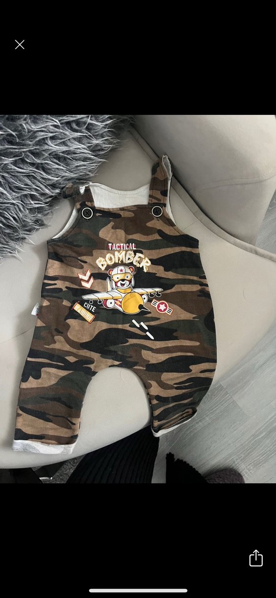 Renkli kahverengi kamuflaj desenli, askılı ve tokalı, erkek çocuklar için tulum. ✈️ Yıkanmaya bağlı solukluğu var harici kusursuzdur