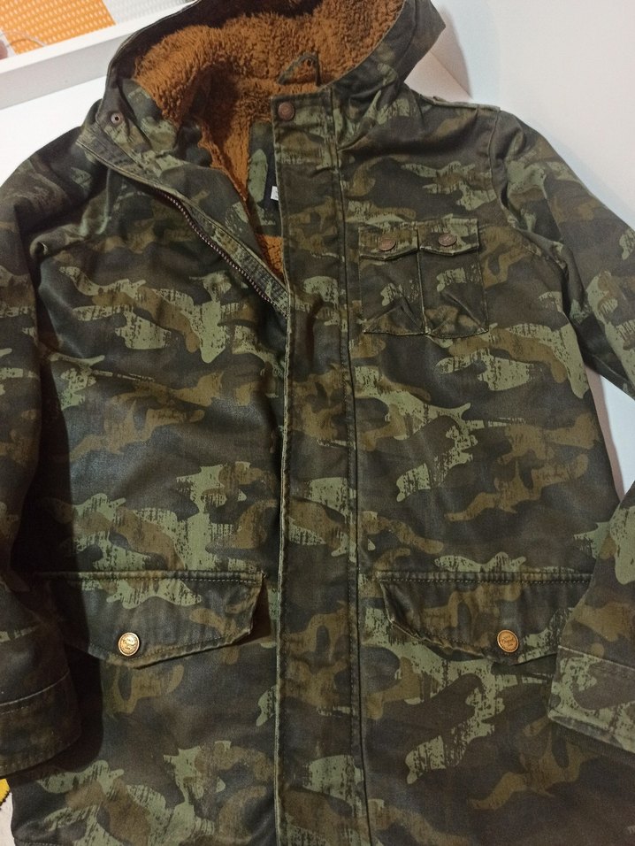 Bu erkek çocuk kabanı, kamuflaj desenli ve düğmeli kapamalı, kesik yakalıdır. Gevşek kesimi ve koyu renk sentetik kumaşı ile rahat ve şık bir görünüm sunar.