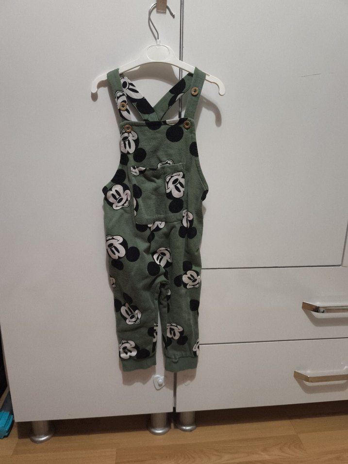 Erkek çocuklar için düğmeli askılı, koyu yeşil kamuflaj desenli, bol kesim ve kolsuz salopet. Sokak stili için rahat sentetik kumaş.